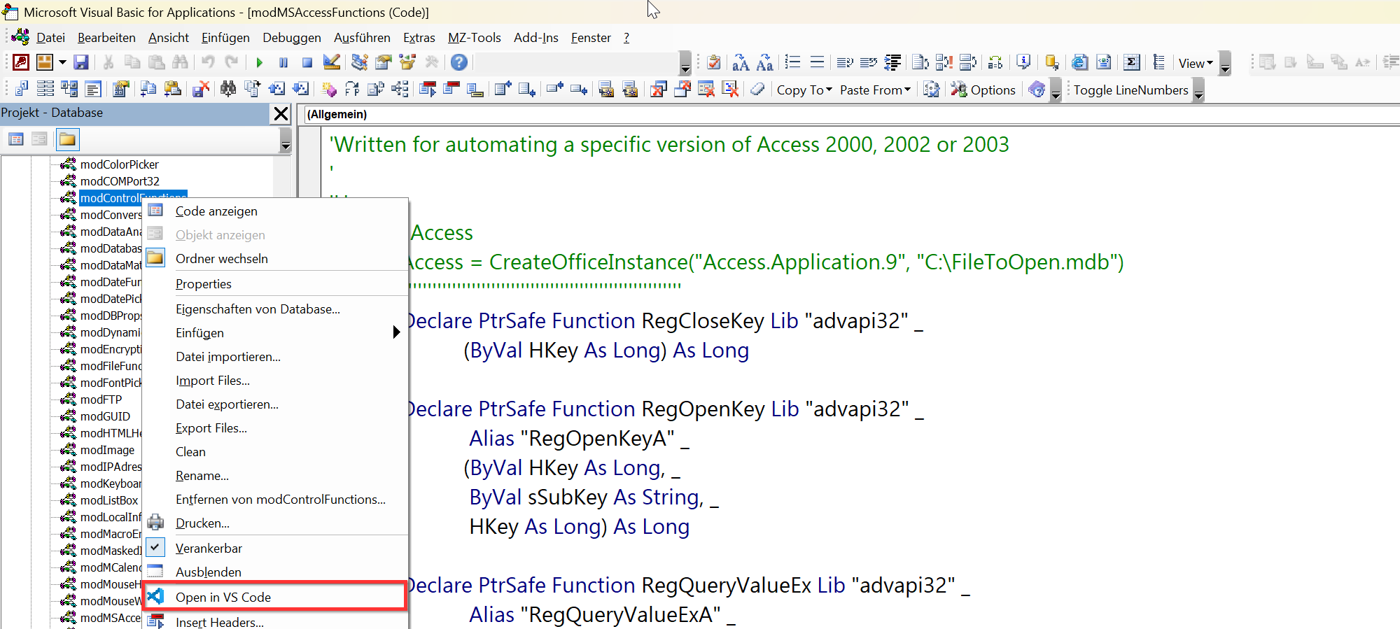 Mit einem einfachen Rechtsklick auf ein Modul, eine Klasse oder eine UserForm können die ausgewählten Code-Dateien direkt in Visual Studio Code geöffnet werden.