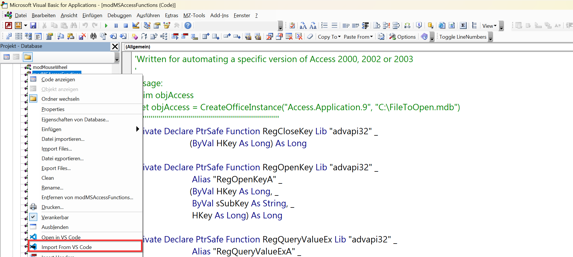 Das VBA Add-In – OpenInVSCode integriert sich nahtlos in den Projektexplorer des VBA-Editors von Microsoft Access, Excel und Word.